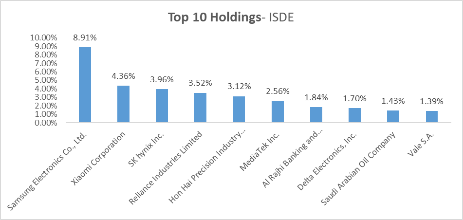 ISDE offers diversification outside developed markets, with exposure to Asian tech and Middle Eastern financials.