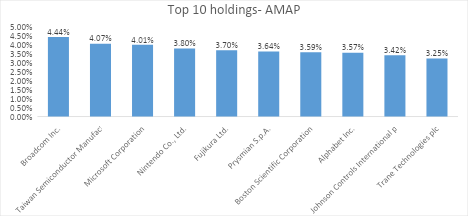 AMAP holds 41 individual holdings, with the top 10 (~37.49% of portfolio) as of Aug 29, 2025, including: